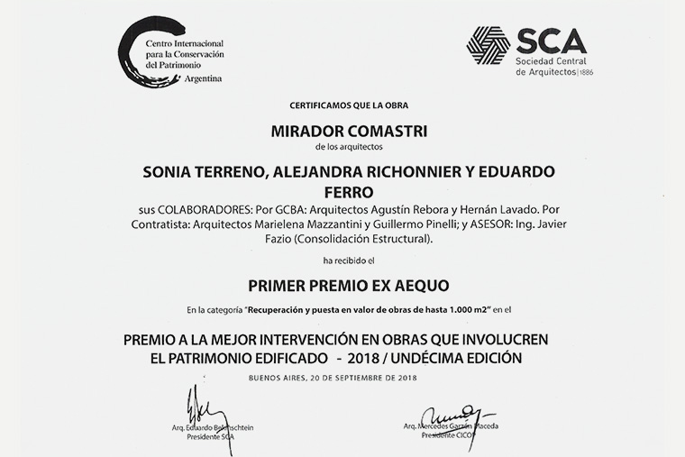 Premio SCA-CICOP a la mejor intervención en obras que involucren el patrimonio edificado por la obra RECUPERACIÓN Y PUESTA EN VALOR DEL MIRADOR COMASTRI. 2018