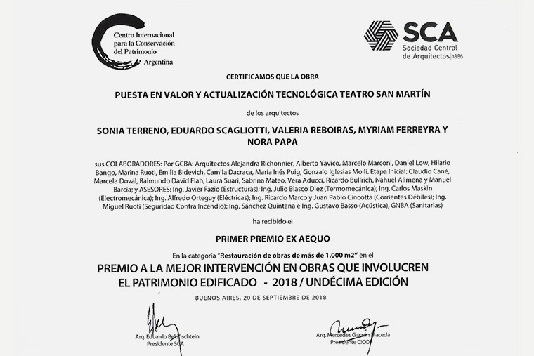 Premio SCA-CICOP a la mejor intervención en obras que involucren el patrimonio edificado por la OBRA PUESTA EN VALOR Y ACTUALIZACIÓN TECNOLÓGICA DEL TEATRO SAN MARTÍN.2018